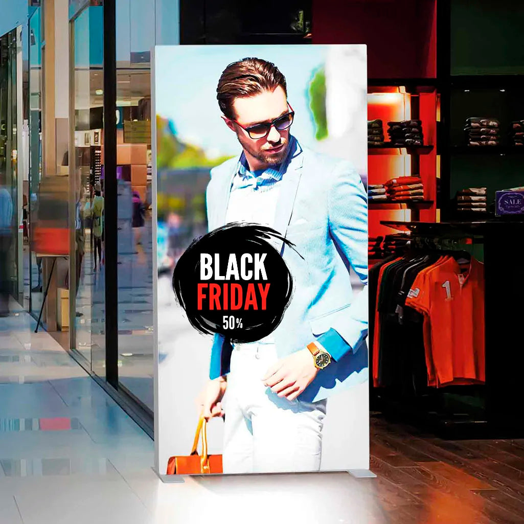 Podemos realizar cualquier medida ó otras configuraciones como textil a una ó dos caras, pies curvos, pies rectos, colgadores para pared ó techo, añadirle lejas, portafolletos, focos, etc... incluso podemos curvar el perfil para crear diseños sin limite.