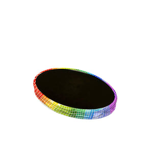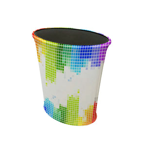 El textil impreso cubre toda la superficie visible excepto la tabla superior negra. Diseñado para añadir un punto de publicidad moderna, de forma sencilla y reutilizable.