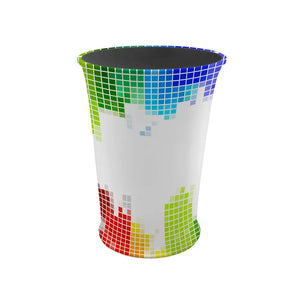 Mostrador para eventos con forma ovalada. El textil impreso cubre toda la superficie visible excepto la tabla superior negra. Diseñado para añadir un punto de publicidad moderna, de forma sencilla y reutilizable.