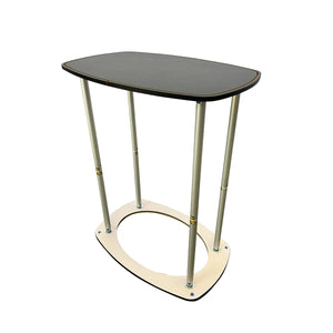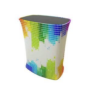 Mostrador para eventos con forma rectangular. El textil impreso cubre toda la superficie visible excepto la tabla superior negra. Diseñado para añadir un punto de publicidad moderna, de forma sencilla y reutilizable.
